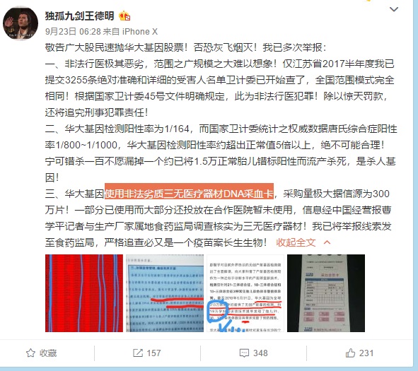 近期,華大基因各類負(fù)面?zhèn)涫苌鐣?huì)關(guān)注。前幾日,王德明發(fā)微博稱,華大基因使用非法劣質(zhì)三無醫(yī)療器材DNA采血卡,已向江蘇衛(wèi)計(jì)委舉報(bào)其非法行醫(yī),引發(fā)刷屏關(guān)注。