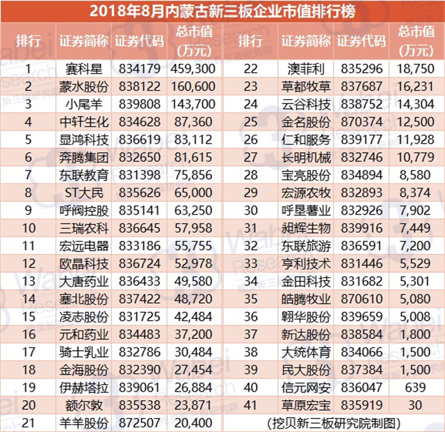 附:2018年8月內(nèi)蒙古新三板企業(yè)市值排行榜
