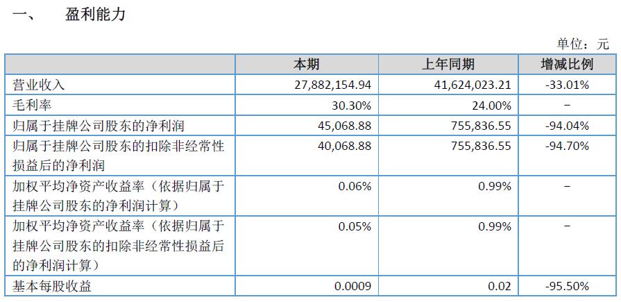 報告期,公司實現(xiàn)營業(yè)收入為52,632,775.81 元,較上年同期減少28.69%,公司凈利潤為-3,322,893.37 元,較上年同期減了433.52%,主要原因是本期營業(yè)收入較上年同期減少了28.70%,且本期由于子公司人員工資調整,管理費用較上年同期增加了68.45%,加上本期公司財務費用較上年同期增加了62.94%,因此本期凈利潤較上年同期降幅較大。扣除非經(jīng)常性損益后的凈利潤為-3,316,844.69元,較上年同期減少616.36%。