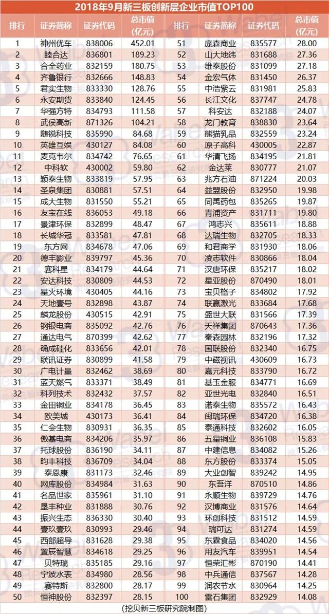 附:2018年9月全國(guó)新三板創(chuàng)新層企業(yè)市值TOP100