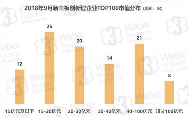 截止到2018年9月30日,新三板共有10946家掛牌公司,其中,創(chuàng)新層有933家企業(yè),占比8.5%。挖貝新三板研究院梳理出2018年9月全國(guó)新三板創(chuàng)新層企業(yè)市值TOP100(以下簡(jiǎn)稱:TOP100)。