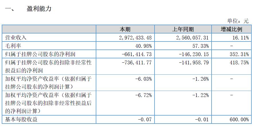 1、報(bào)告期內(nèi),公司實(shí)現(xiàn)銷(xiāo)售收入297.24 萬(wàn)元,比上年同期相比提高16.11%;資產(chǎn)總計(jì)1,218.93萬(wàn)元,凈資產(chǎn)1,063.24 萬(wàn)元,與上年同期相比略有下降;凈利潤(rùn)-66.14 萬(wàn)元,虧損較上年增加352.31%。與去年同期相比公司虧損增加主要是由于新開(kāi)發(fā)的集成業(yè)務(wù)毛利率較低,使得營(yíng)業(yè)成本增加;同時(shí),公司加大研發(fā)投入,研發(fā)費(fèi)用增加;最后,公司為符合公司的業(yè)務(wù)發(fā)展更換主辦券商,使得公司的審計(jì)咨詢(xún)費(fèi)、證券顧問(wèn)費(fèi)大幅增加所致。
