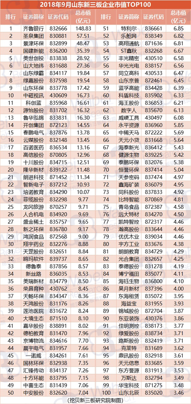 附:2018年9月山東新三板企業(yè)市值TOP100