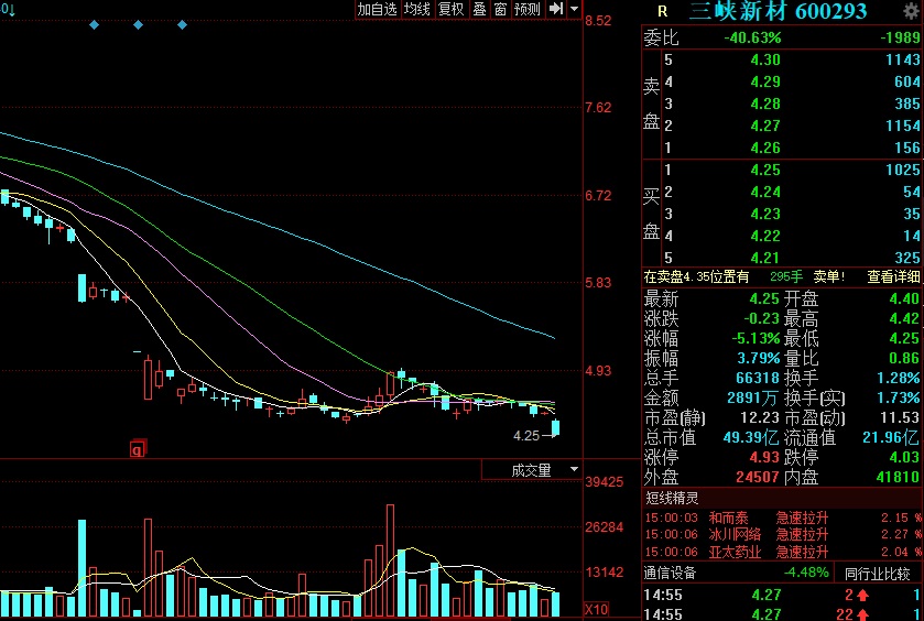 回購前期,三峽新材股價持續(xù)下跌。8月8日開始回購股份,公司股價維持在4元/股至5.1元/股。今日,三峽新材股價報收于4.25元,是盤中最低價,同時是自2015年9月以來的股價最低點。