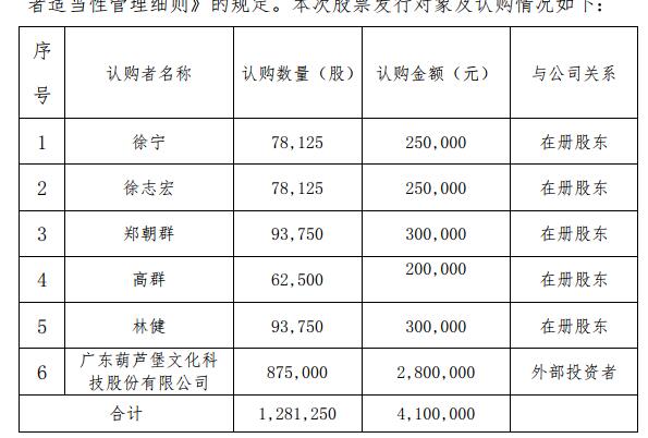據(jù)介紹,喜之家計(jì)劃以3.2元/股價(jià)格向董事長(zhǎng)徐寧、董事徐志宏、董事鄭朝群、在冊(cè)股東林健、在冊(cè)股東高群以及廣東葫蘆堡文化科技股份有限公司發(fā)行不超過(guò) 128.125 萬(wàn)股,計(jì)劃募資410 萬(wàn)元。