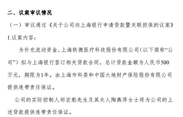 軼德醫(yī)療稱,為補充流動資金,軼德醫(yī)療擬與上海銀行簽訂相關貸款合同,總計貸款金額為人民幣500萬元,期限為1年。由上海市科委和中國大地財產保險股份有限公司提供連帶責任保證。