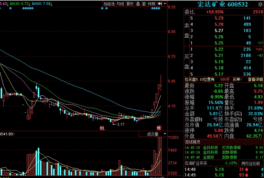 9月27日至10月9日,宏達礦業(yè)在4個交易日中連收漲停,并且成交量明顯放大。宏達礦業(yè)近日股價變動屬異常波動,公司表示,不存在任何應(yīng)披露而未披露的影響股價的重大信息,如資產(chǎn)重組、發(fā)行股份、資產(chǎn)注入等。今日,宏達礦業(yè)股票沖高后回落,截至發(fā)稿,股價為5.22元,成交量已與昨日全天成交量持平。