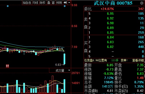 今日,大盤整體走勢不佳,深證成指下跌6.07%。武漢中商股票跳空低開后震蕩向下,近乎跌停,最終,報收于6.85元/股,大跌9.63%。