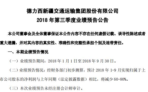 德新交運(yùn)稱,經(jīng)財(cái)務(wù)部門初步測(cè)算,預(yù)計(jì) 2018 年 1-9 月實(shí)現(xiàn)歸屬于上市公司股東的凈利潤(rùn)與上年同期相比,將減少60-80%。