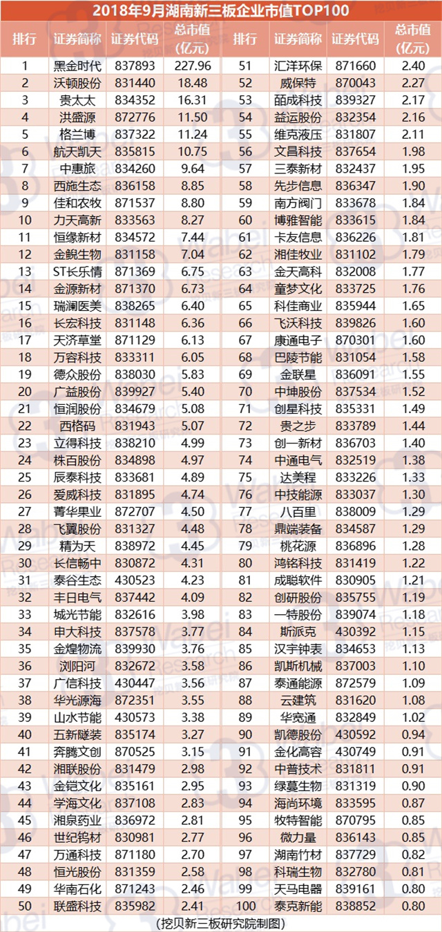 附:2018年9月湖南新三板企業(yè)市值TOP100