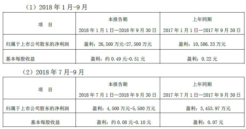 2018年前三季度盈利在2.65億元-2.75億元之間,上年同期盈利1.06億元。