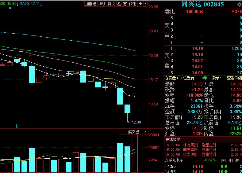 今日,同興達漲停開盤,盤中漲停板被小幅打開,收盤時漲停,報收于14.19元/股,封單5286手。同興達全天共成交了2.39萬手,超上一交易日成交量。