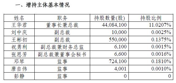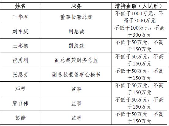 公告稱,董事長兼總裁王華君、副總裁劉中慶、副總裁王彬初、副總裁兼財務總監(jiān)祝勇利、副總裁兼董事會秘書張恩芳、監(jiān)事鄧琴、監(jiān)事唐自偉、監(jiān)事彭靜將增持,其中王華君增持金額不低于1000萬不高于3000萬,其他高管增持金額都不低于50萬。