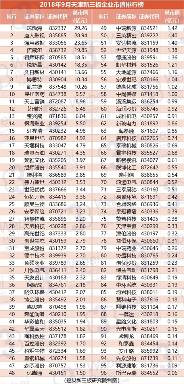 附:2018年9月天津新三板企業(yè)市值排行榜