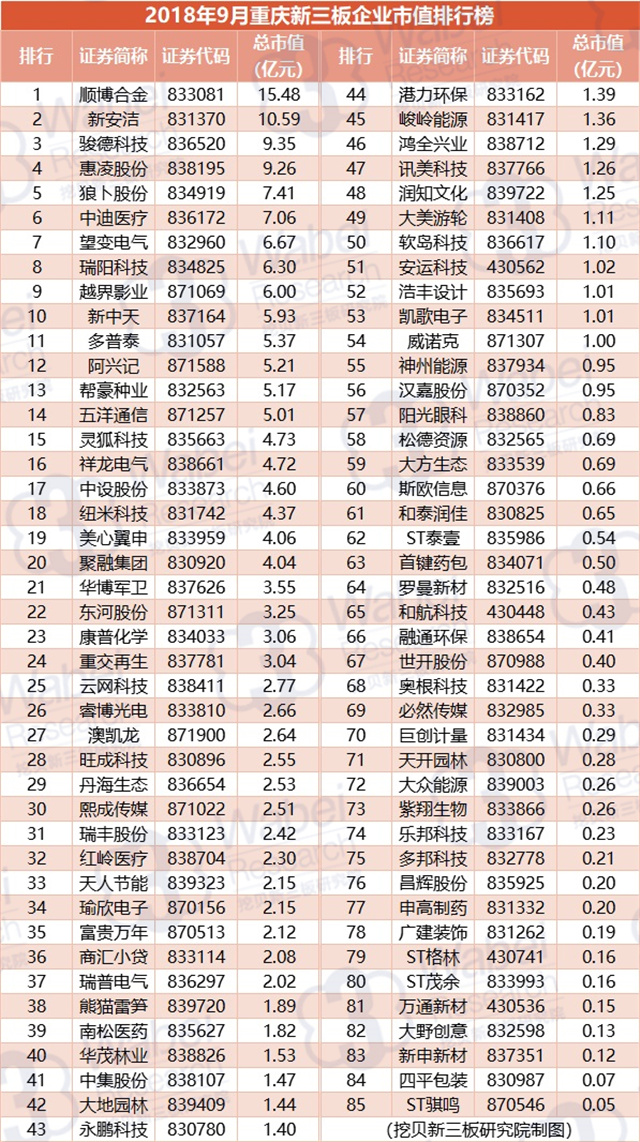 附:2018年9月重慶新三板企業(yè)市值排行榜