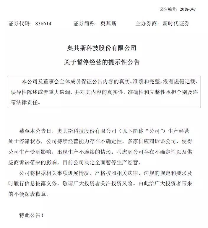 10月18日,奧其斯發(fā)出公告,決定全面暫停生產(chǎn)經(jīng)營。