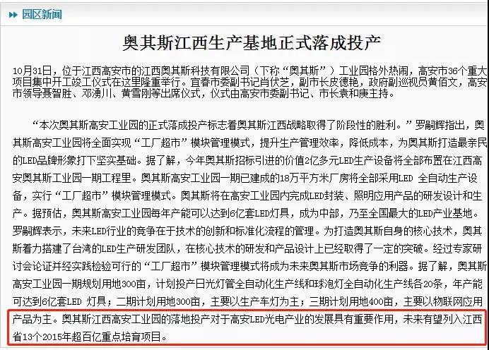江西高安工業(yè)園區(qū)管委會網(wǎng)站的一篇報道顯示,2013年10月31日,奧其斯江西生產(chǎn)基地正式落成投產(chǎn)。