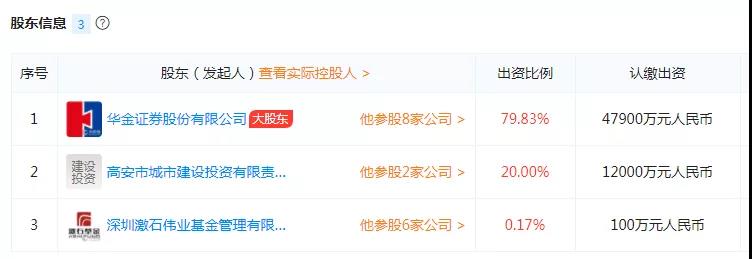 天眼查信息顯示,奧其斯投資共有3名股東,其中華金證券出資比例為79.83%,高安市城市建設(shè)投資有限責(zé)任公司出資20%,深圳激石偉業(yè)基金管理有限公司出資0.17%。