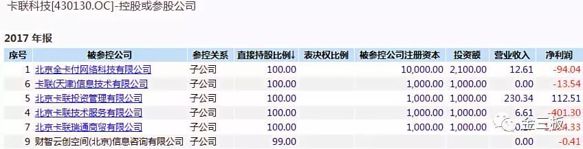 事實上,除了這三筆投資,卡聯(lián)科技還在2014年底,投資設(shè)立了多家全資子公司,而這些子公司如今的經(jīng)營情況,幾乎全線虧損。