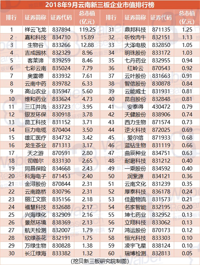 附:2018年9月云南新三板企業(yè)市值排行榜