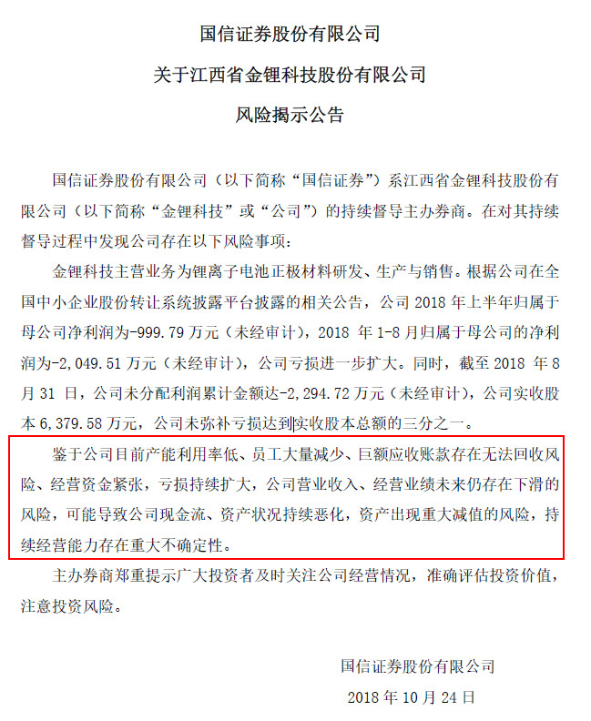 10月24日晚,新三板公司金鋰科技(833616)的主辦券商國(guó)信證券發(fā)出風(fēng)險(xiǎn)提示公告。
