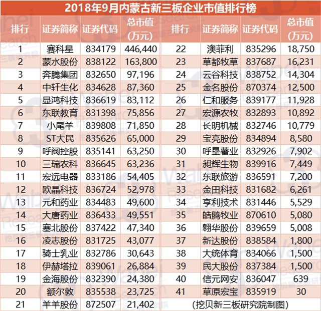 附:2018年9月內(nèi)蒙古新三板企業(yè)市值排行榜