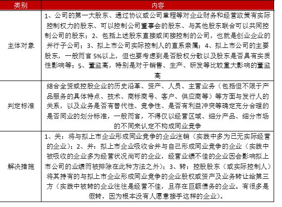 關(guān)于同業(yè)競(jìng)爭(zhēng),證監(jiān)會(huì)審核更看重的是實(shí)質(zhì),而非形式和表面現(xiàn)象,一般而言,擬IPO企業(yè)如若想通過(guò)發(fā)審會(huì),同業(yè)競(jìng)爭(zhēng)最遲應(yīng)于報(bào)告期的最后一年之前解決,以便有充裕的時(shí)間獨(dú)立運(yùn)營(yíng),以便審核人員判定公司的經(jīng)營(yíng)情況。