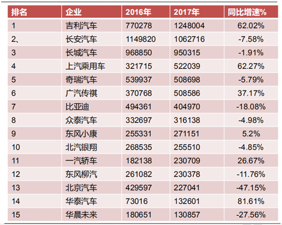 研究資料顯示,2015年以來(lái),我國(guó)自主車企品牌乘用車市場(chǎng)占有率逐年提高,截止2017年,我國(guó)自主品牌乘用車銷量連續(xù)兩年超過(guò)千萬(wàn)輛,全年銷售1084.7萬(wàn)輛,同比增長(zhǎng)3%;占乘用車銷售總量的43.9%,市場(chǎng)份額同比提高0.7個(gè)百分點(diǎn),而眾泰汽車在我國(guó)自主品牌乘用車企中市占率排名第8,如下所示: