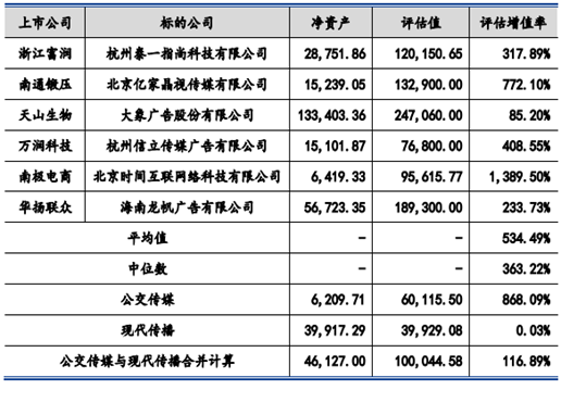 考慮到估值,截至評估基準(zhǔn)日 2018 年 3 月 31 日,公交傳媒的凈資產(chǎn)為 6,209.71 萬元,評估值為 60,115.50 萬元,評估增值 53,905.79 萬元,評估增值率為 868.09%;現(xiàn)代傳播的凈資產(chǎn)為 39,917.29 萬元,評估值為 39,929.08 萬元,評估增值 11.79 萬元,評估增值率為 0.03%。