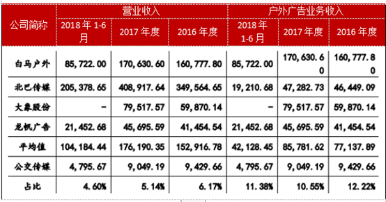 從收入規(guī)模來看,公交傳媒也與行業(yè)平均水平相去甚遠(yuǎn),營業(yè)收入方面,公交傳媒僅占行業(yè)均值比例為4.60%,而戶外廣告收入方面,公交傳媒僅占行業(yè)均值比例為11.38%,具體情況如下:
