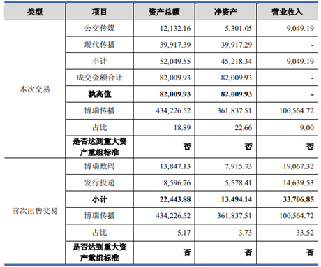從并購報告書來看,博瑞傳播此次交易擬向成都傳媒集團(tuán)(以下簡稱成都傳媒)以發(fā)行股份的方式購買其持有的現(xiàn)代傳播 100%股權(quán)及公交傳媒 70%股權(quán)。現(xiàn)代傳播 100%股權(quán)作價為 39,929.08 萬元,公交傳媒 70%股權(quán)作價為 42,080.85 萬元,這意味著此次交易價格合計 82,009.93 萬元。需要注意的是,成都傳媒是博瑞傳播的控股股東,持有上市公司32.40%股份,實際控制人為成都國資委,而現(xiàn)代傳播和公交傳媒分別是成都傳媒全資子公司和持股70%的企業(yè),因此此次交易構(gòu)成關(guān)聯(lián)交易。
