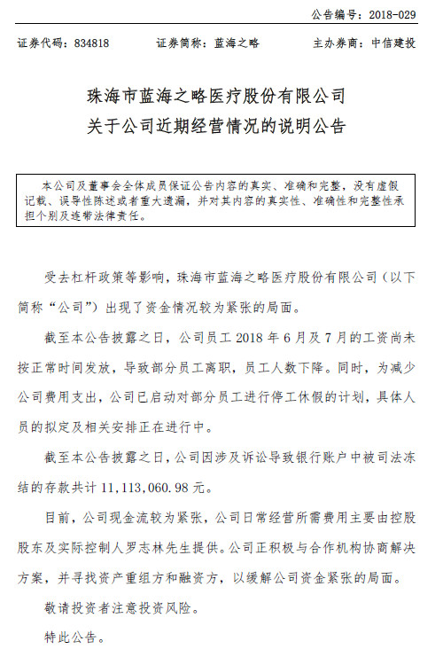 在8月21日,藍(lán)海之略曾發(fā)布公告,對(duì)公司最近的經(jīng)營(yíng)情況進(jìn)行說明。公司稱,受去杠桿政策等影響,公司出現(xiàn)了資金較為緊張的局面。