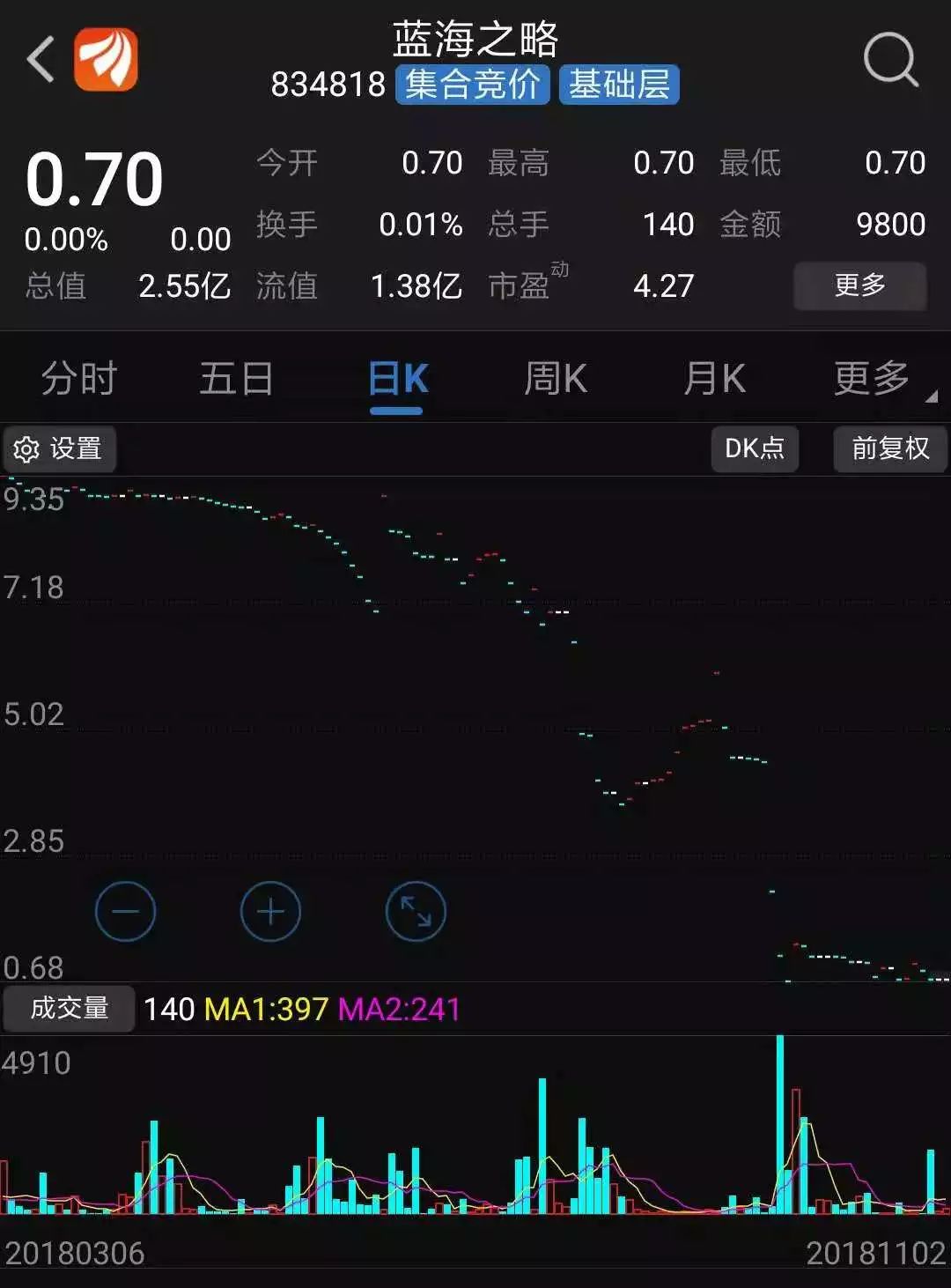 2018年1月15日,新三板集合競(jìng)價(jià)實(shí)施的第一個(gè)交易日。藍(lán)海之略收盤價(jià)為9.35元/股,到2018年5月18日,其股價(jià)跌至7.01元/股,跌幅達(dá)到25%。