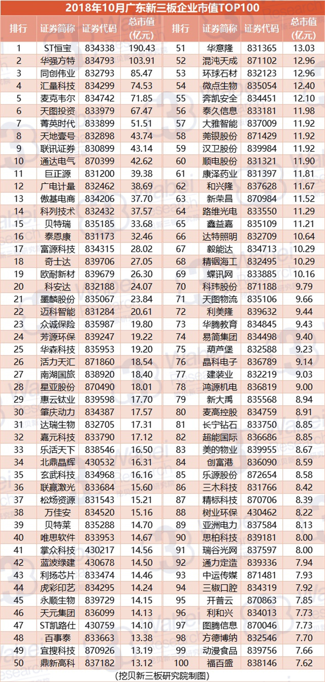 附:2018年10月廣東新三板企業(yè)市值TOP100