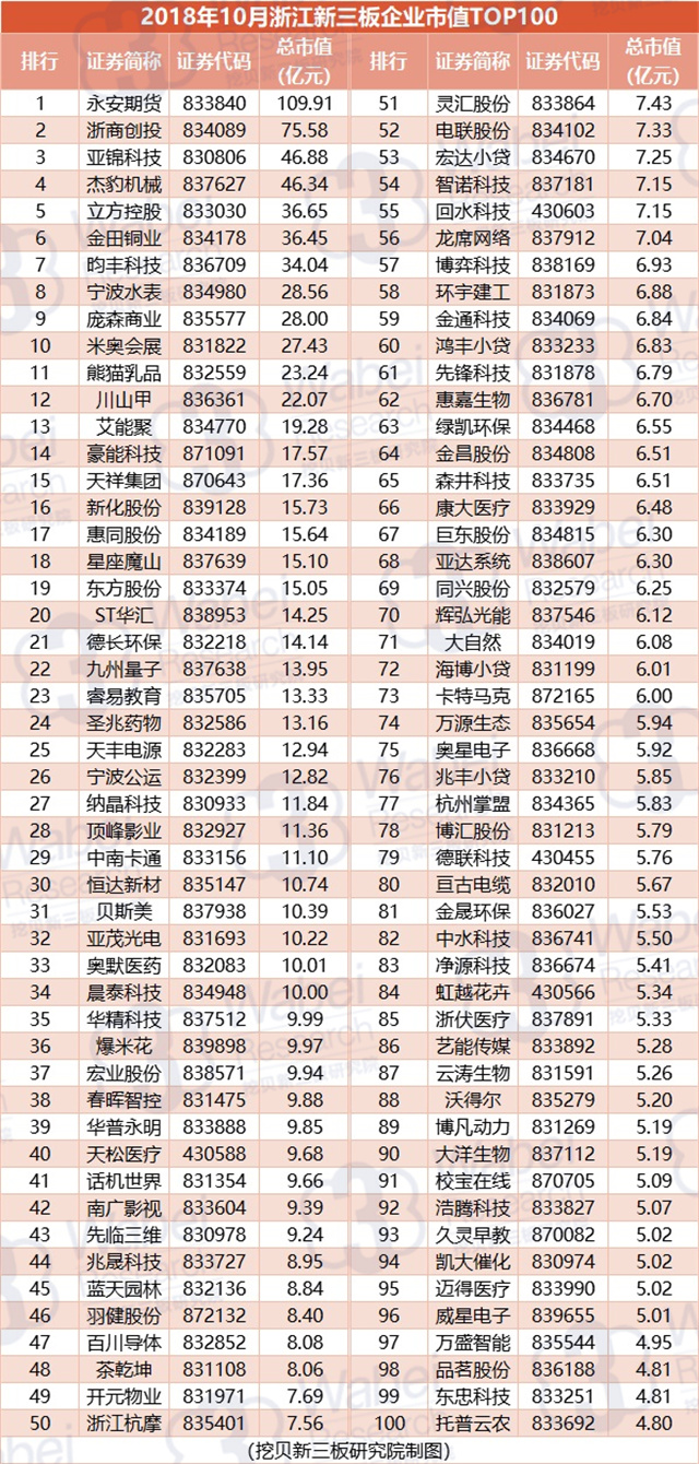 附:2018年10月浙江新三板企業(yè)市值TOP100