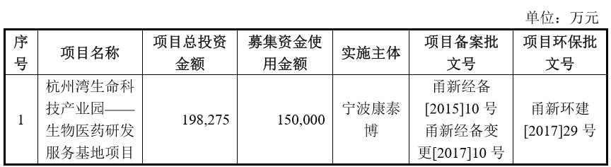 募投項(xiàng)目只有一個(gè),杭州灣生命科技產(chǎn)業(yè)園的生物醫(yī)藥研發(fā)服務(wù)基地項(xiàng)目,總投資額19.83億元,擬使用募資金額15億元。