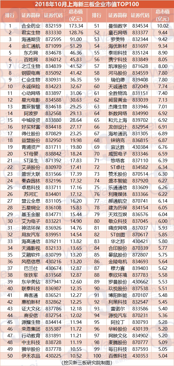 附:2018年10月上海新三板企業(yè)市值TOP100