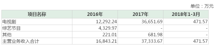 新媒誠(chéng)品每年約生產(chǎn)2-3部電視劇作品,并參與部分電視劇的發(fā)行,其收入與其當(dāng)年售出的電視劇高度相關(guān),2016和2017年,公司電視劇收入占主營(yíng)業(yè)務(wù)收入比例分別為72.98%和98.17%。
