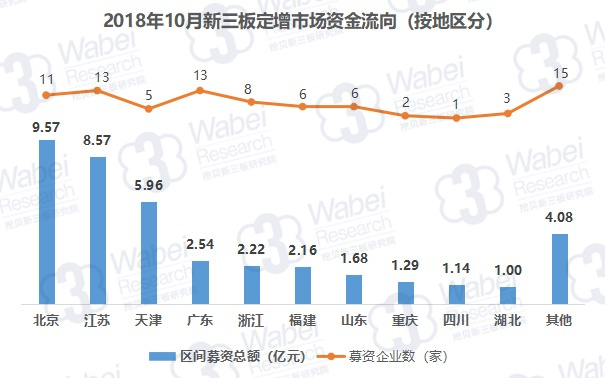 上月,新三板定增市場(chǎng)上,吸引資金排名前三的地區(qū)是北京、江蘇和天津,三地共募資24.1億元,占新三板企業(yè)募資總額的60%。