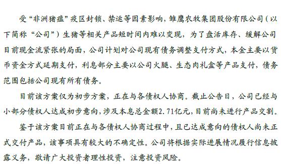 鷹農牧稱,為了盤活庫存、緩解公司目前現(xiàn)金流緊張的局面,公司計劃用火腿、生態(tài)肉禮盒等產品支付債務利息。目前該方案僅為初步方案,正在與各債權人協(xié)商。截止公告日,公司已經與小部分債權人達成初步意向,涉及本息總金額2.71億元,目前尚未進行產品交割。