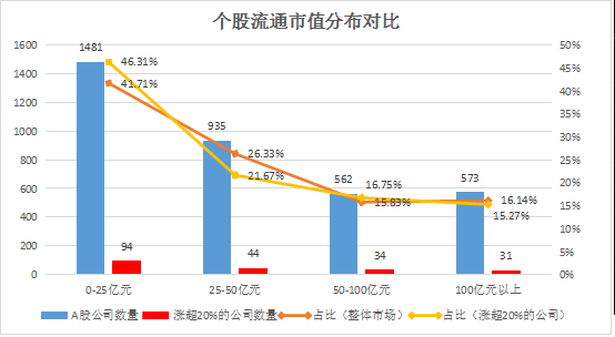 再看看近20個(gè)交易日漲幅超20%的個(gè)股情況,可以發(fā)現(xiàn),總共有203家公司股價(jià)近20個(gè)交易日漲幅超20%,其中流通市值不足25億元的占比最高,達(dá)到46.31%;而流通市值不足50億元的占比68%。值得注意的是,流通市值不足25億元的公司在市場(chǎng)上占比41.71%,而近20個(gè)交易日以來(lái),漲幅超20%的個(gè)股里,流通市值不足25億元的公司占比明顯高于市場(chǎng)整體比例。