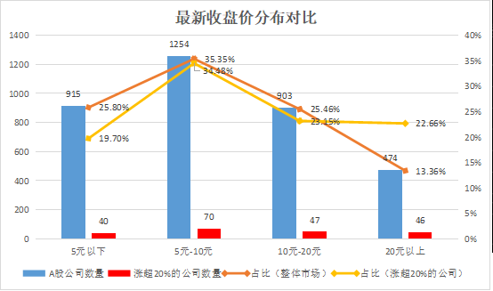而在近20個(gè)交易日股價(jià)漲幅超20%的203家公司中,其中股價(jià)不足5億元的占比為19.7%;不足10元的占比54.19%。而這一比例還低于市場(chǎng)整體比例。表明,近期超跌低價(jià)股雖然漲勢(shì)“喜人”,但是市場(chǎng)上超跌的太多了,很多低價(jià)股并未啟動(dòng)。