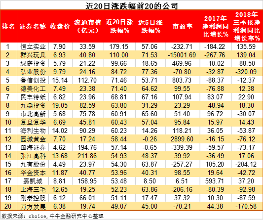 金證互通旗下的牛牛金融研究中心統(tǒng)計(jì)發(fā)現(xiàn),自指數(shù)探底以來(lái),近20個(gè)交易日共有19家公司股價(jià)漲幅超50%,其中恒立實(shí)業(yè)與群興玩具實(shí)現(xiàn)翻倍。這20家公司多數(shù)在本周漲幅巨大。仔細(xì)分析發(fā)現(xiàn),近20個(gè)交易日漲幅前20的公司,11家公司市盈率高于30倍,7家是負(fù)的市盈率;2017年僅9家公司實(shí)現(xiàn)凈利潤(rùn)同比正增長(zhǎng),2018年3季報(bào)則僅8家盈利增長(zhǎng)。也就是說(shuō),這些公司要么就是高估值,要么就是業(yè)績(jī)差。