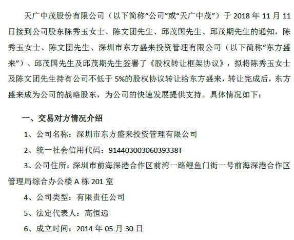 東方盛來(lái)的訂單放進(jìn)了購(gòu)物框。第一步從天廣中茂(002509)原第一大股東陳秀玉及關(guān)聯(lián)方陳文團(tuán),收購(gòu)不低于5%的股權(quán)。