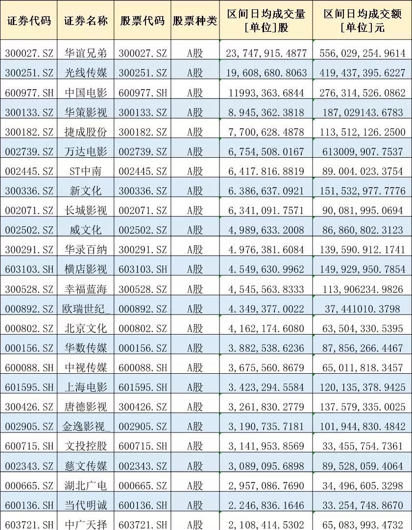25只A股影視股票,則每天都有成交,平均一天成交最低的中廣天擇也有210萬股成交量和6508萬成交額,超過了成交額最高的森宇文化;成交高的華誼兄弟,平均一天成交2374股,金額是5.5602億,是森宇文化的18倍,零頭都是森宇文化成交額的兩倍多。