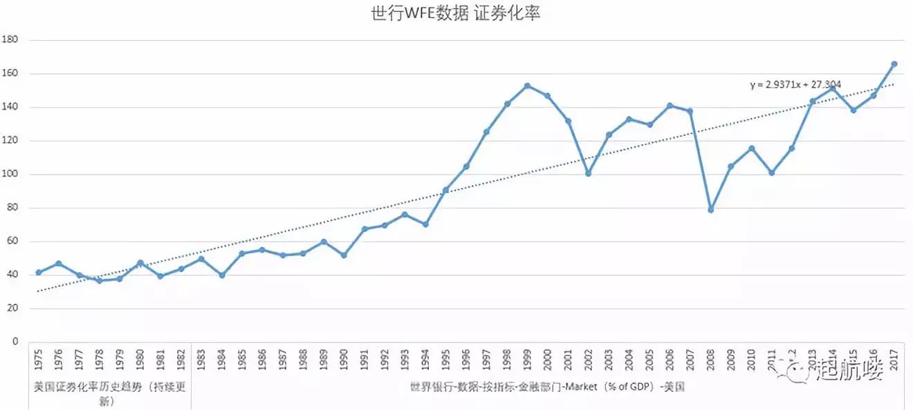 我們一般用證券化率指標(biāo)衡量一國上市公司市值的情況,從美國1975年以來數(shù)據(jù)看,其平均值、中位值達(dá)90%以上,1996年以來除2008年證券化率48.75%外長期高于100%,只有4年低于110%,2013年后更是基本在140%以上,最高已達(dá)165.7%。
