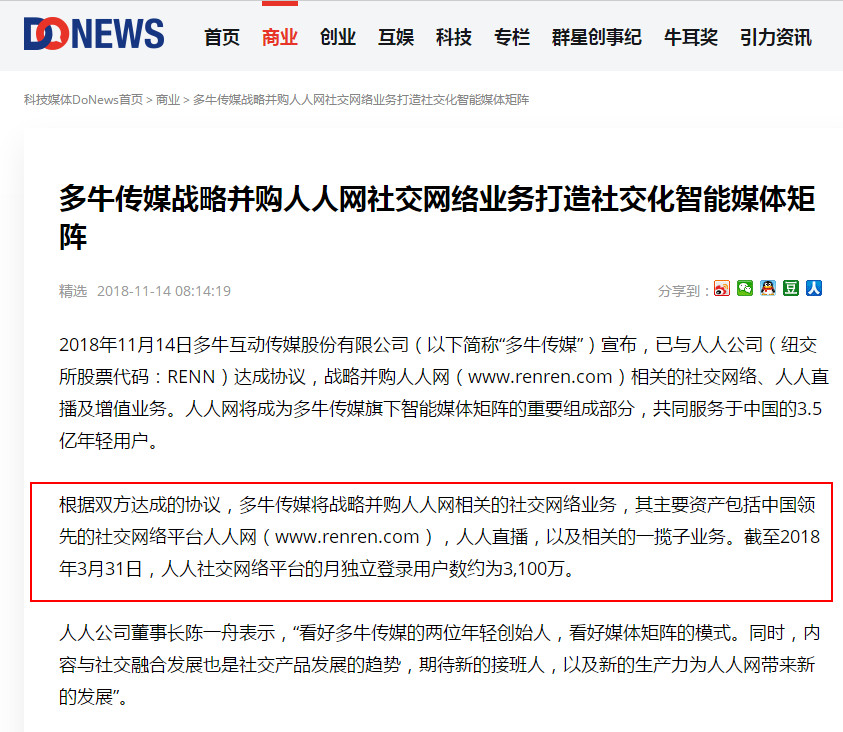 回應(yīng)顯示,多牛傳媒與人人公司達成協(xié)議,戰(zhàn)略并購人人網(wǎng)相關(guān)的社交網(wǎng)絡(luò)、人人直播及增值業(yè)務(wù)。截至2018年3月31日,人人網(wǎng)社交平臺的月獨立登陸用戶數(shù)約為3100萬。