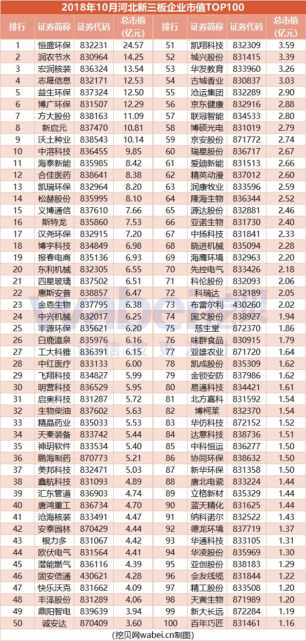 附:2018年10月河北新三板企業(yè)市值TOP100