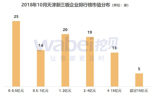 排行榜榜單中有5家企業(yè)市值超過15億元,而市值在0-0.5億元、0.5-1億元、1-2億元、2-4億元、4-15億元的企業(yè)分別有25家、14家、20家、19家、13家。